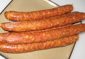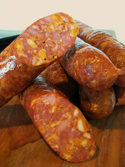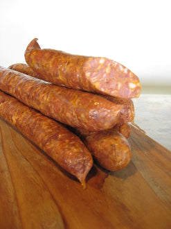 Pork, Red Wine, Garlic, Salt, New Mexico Chili, Cayenne, Paprika, Red Chili Flakes, Black Pepper, Thyme, Nutmeg, Allspice, and Cure.