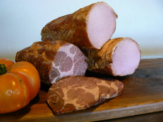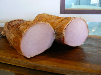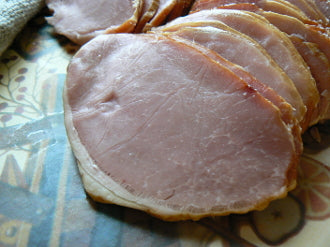 Whether you use our Canadian Bacon for with an english muffin and egg, or on your own home-made pizza, it will quickly become one of your favorite products! Once our bacon has cured for seven days, we naturally smoke the bacon the old-fashioned way with real wood chips. This meaty bacon comes from the loin, and thus is much less fatty then regular bacon. Our loin-cut Canadian bacon is similar in many ways to our cottage bacon, which is cut from the shoulder.