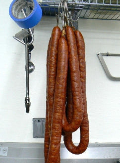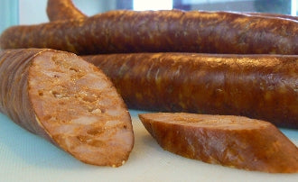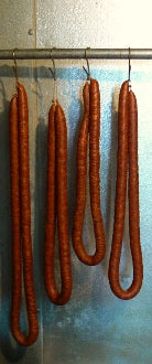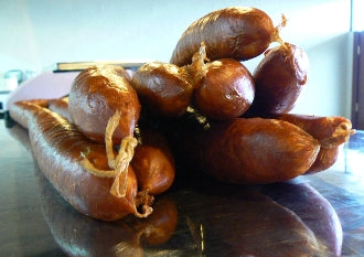Linguica originates in Portugal, but is also common in Spain and Brazil. It’s a coarse ground, lightly smoked pork sausage flavored with smoked paprika, garlic, red chilies, and red wine. It is a leaner sausage with distinctive flecks of coarse ground fat. It is often a component of hearty stews like the Brazillian Feijoada, or as a pork component of Portuguese fish stews, but I remember best from breakfast cafes along the California coast where it was served in scrambles or simply grilled and served on a bun with roasted peppers.